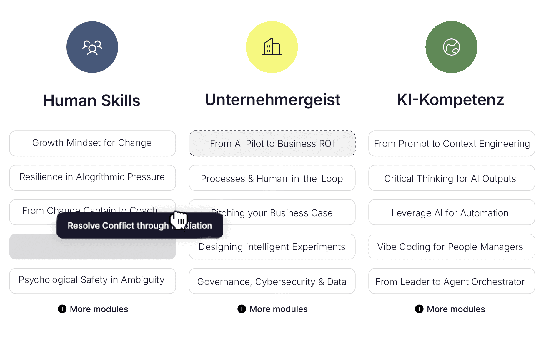 Mit unseren bewährten Enablement Programmen, befähigst du deine Führungskräfte, KI-Adoption in echten Unternehmenserfolg zu verwandeln.